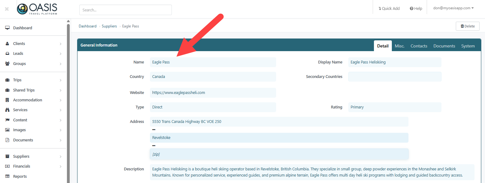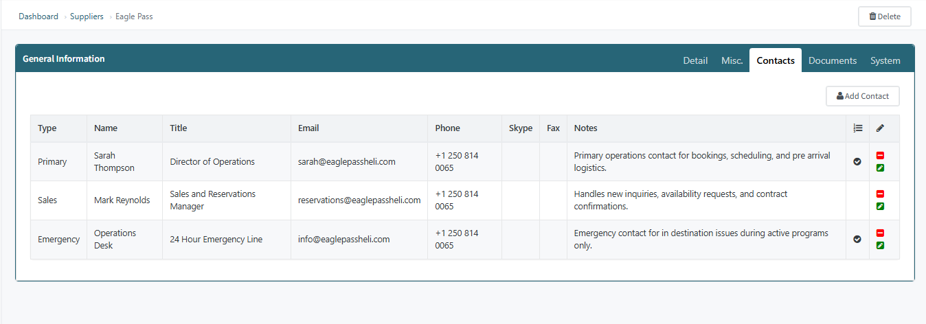 Adding contacts at the Supplier level ensures your team always knows who to reach for reservations, logistics, accounting, or emergencies.