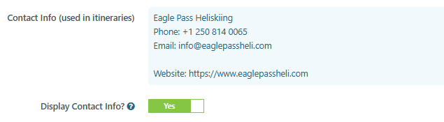 Contact Info Used in Itineraries:  This field defines the default contact details that may appear on confirmations and in the mobile app.
