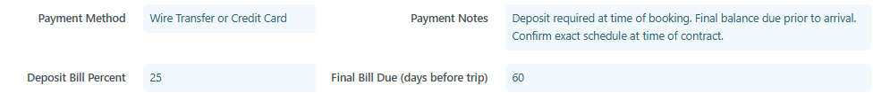 • Final Bill Due: Define how many days before the trip the final payment is due.