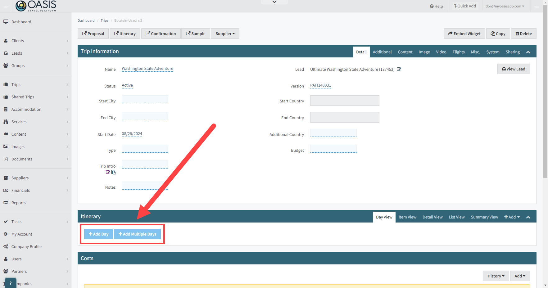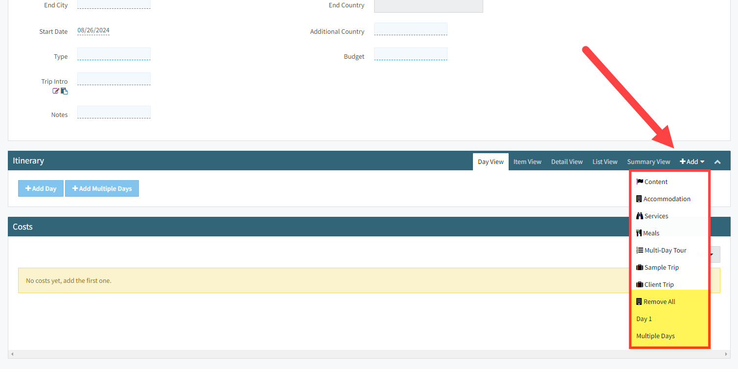 If you don't have any days on the Itinerary yet, click either '+Add Day' to add 1 day OR click '+Add Multiple Days' to add 2 or more days to the trip itinerary.