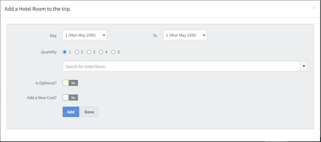 • To (Dropdown): If the stay is more than one day, use this to select the last day. The options will match the trip dates.