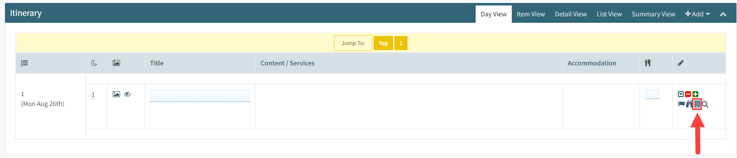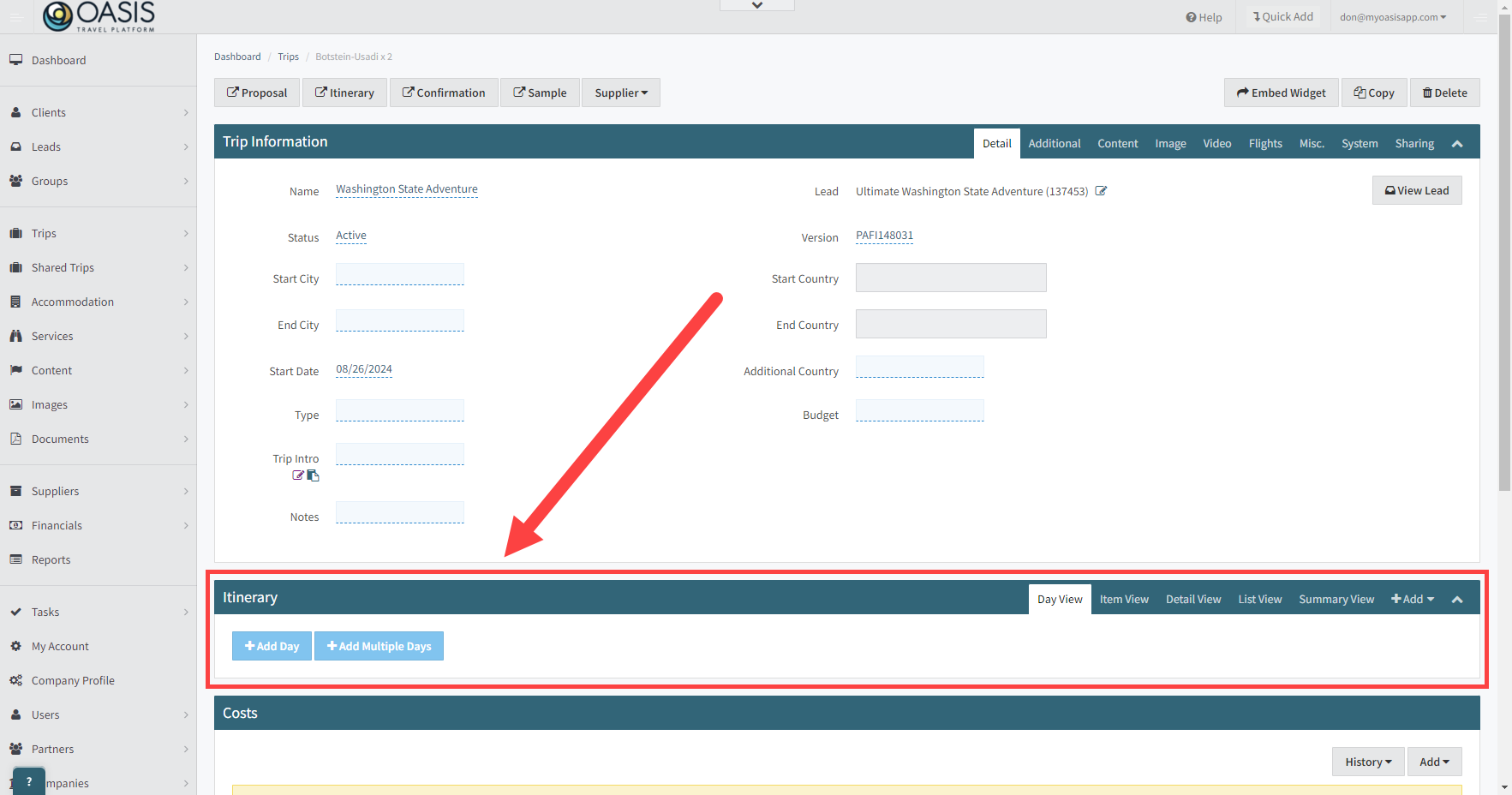 First, open the trip page you are working on and navigate to the Itinerary section. This section is where you'll build out the day-by-day details of the trip, including all accommodations, activities, and services.